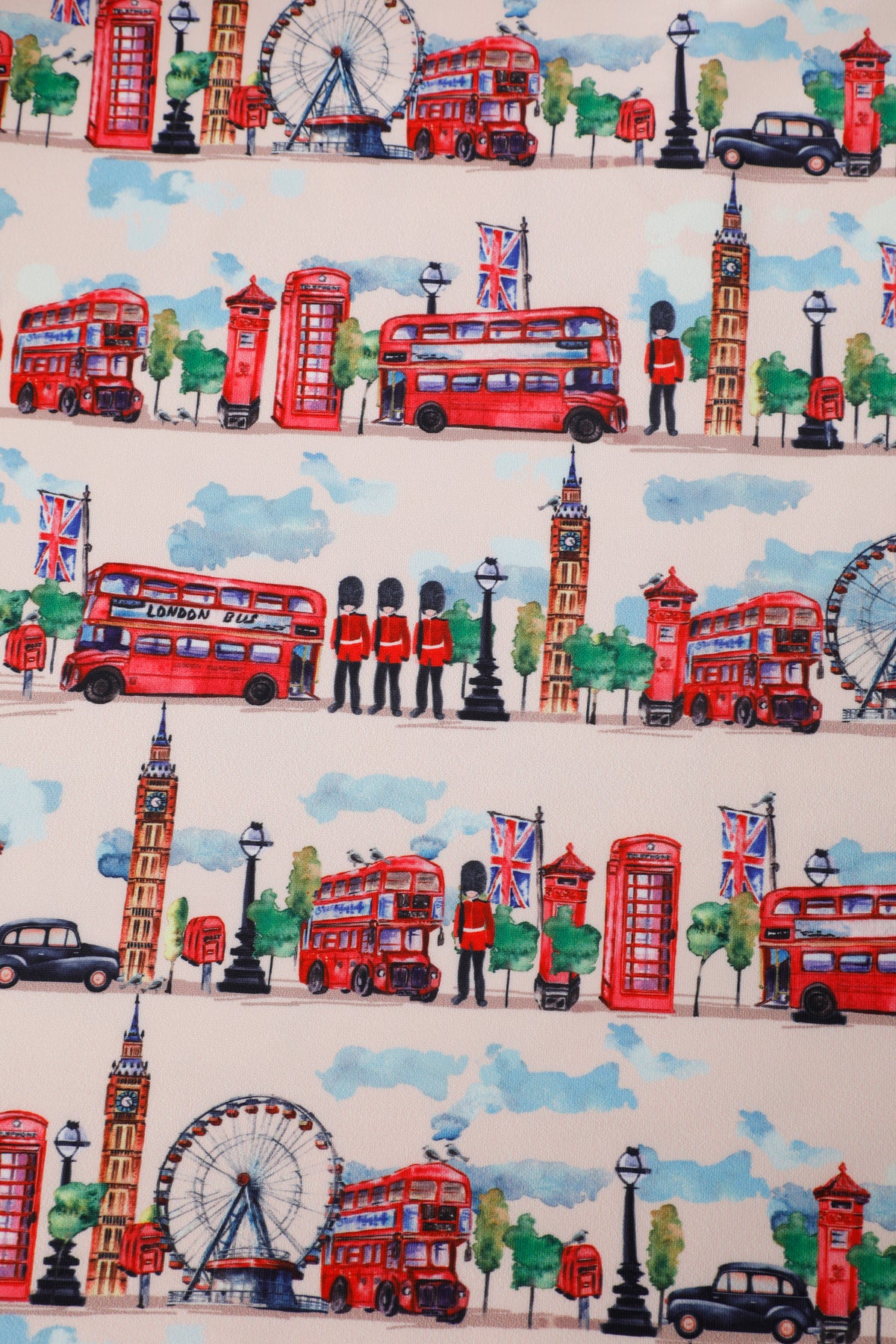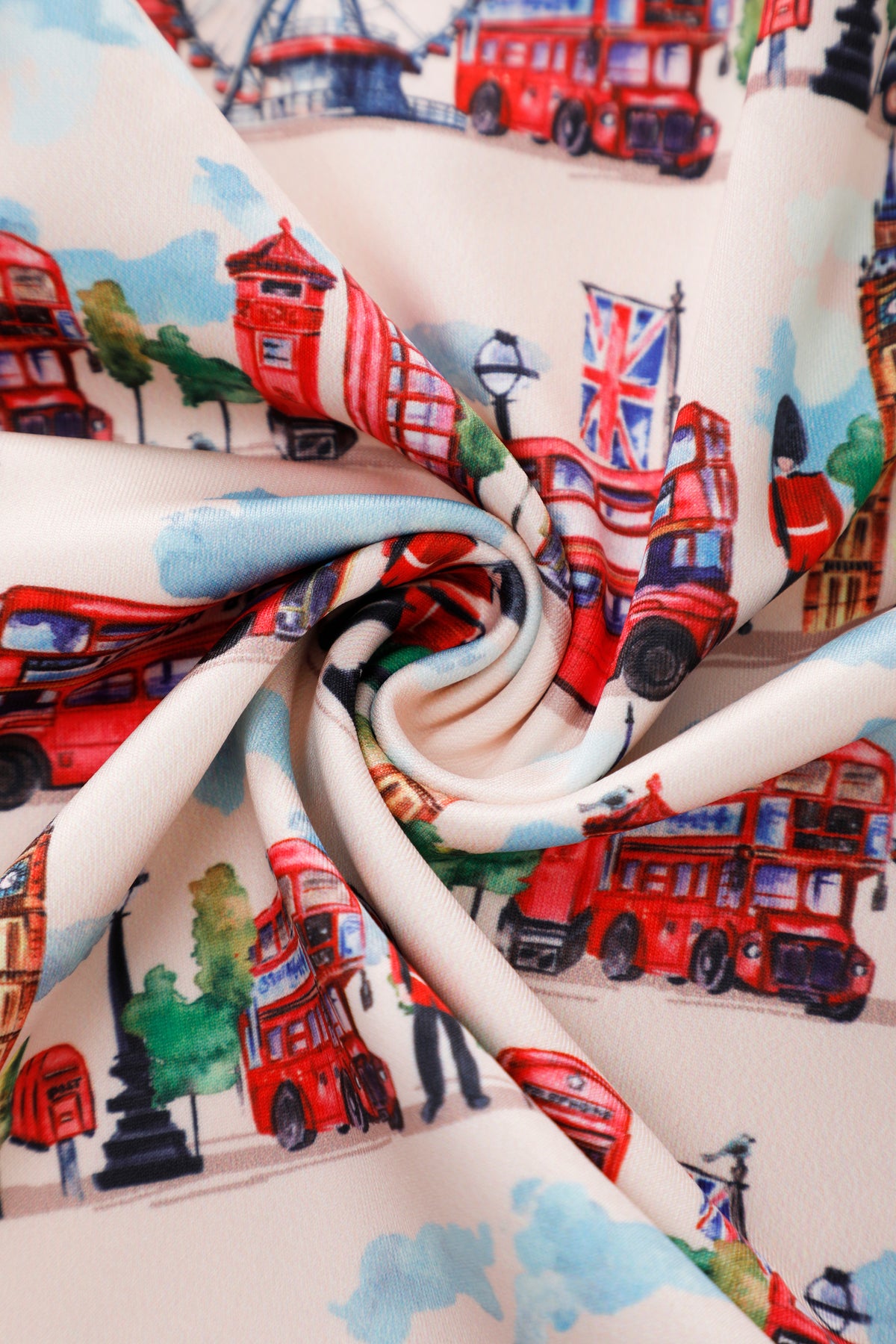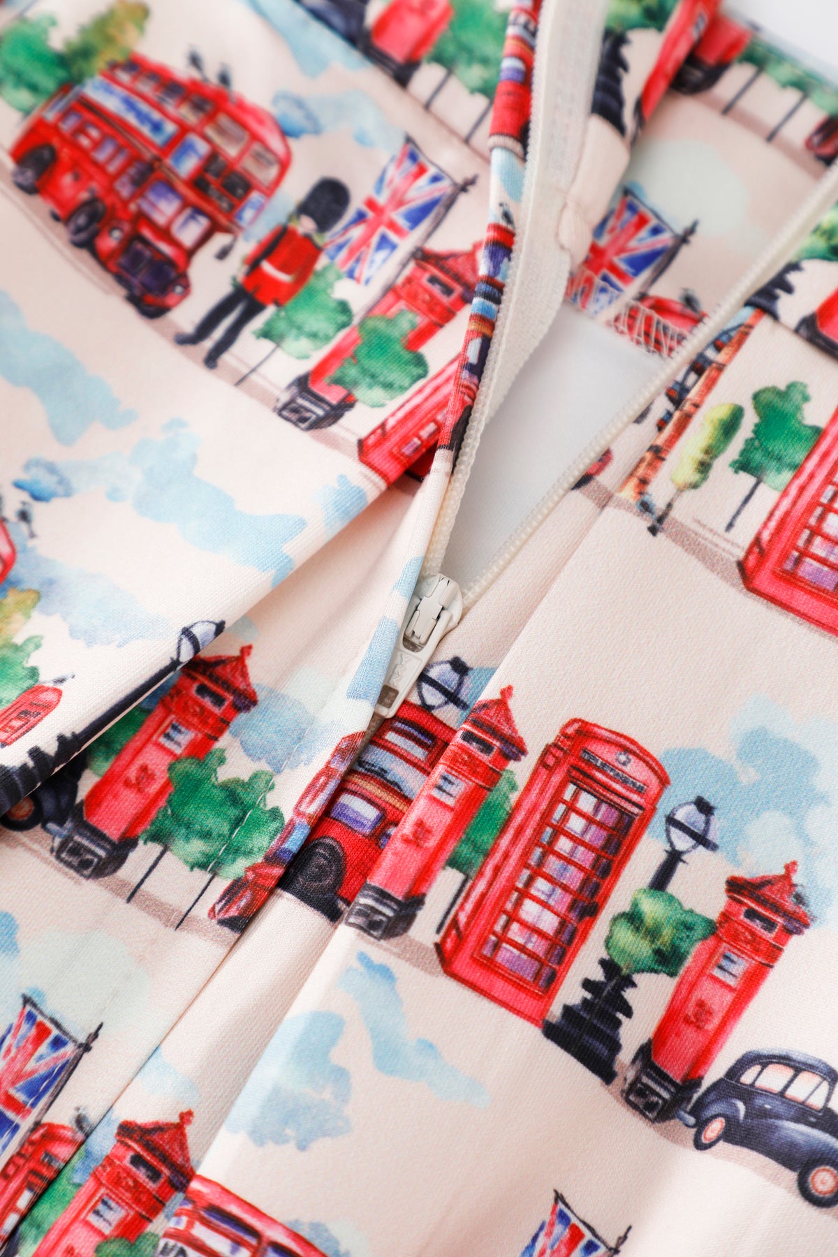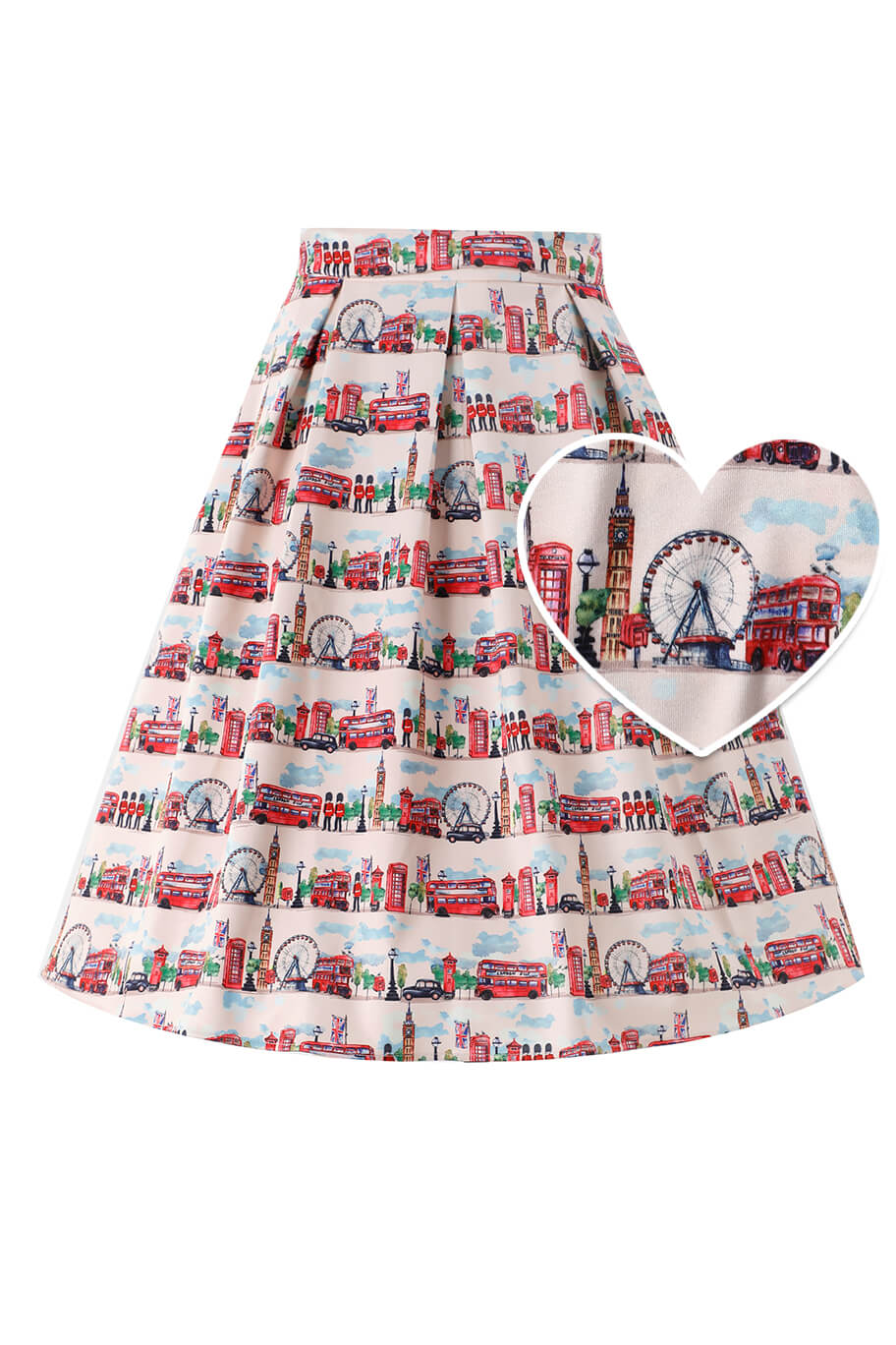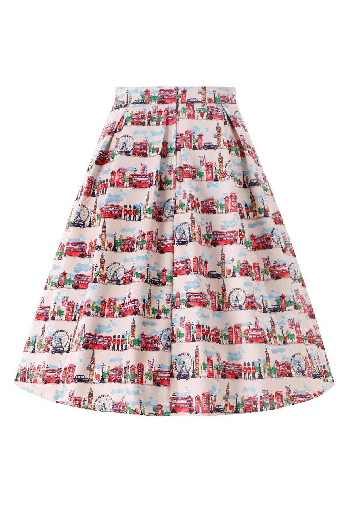 Celebrate iconic city style with the Aisley London Pleated Midi Skirt. Set against a crisp white backdrop, this charming design features illustrated landmarks of London, from Big Ben and the Tower Bridge to classic red buses and telephone boxes. The high-waist fit and full pleats create a flattering, flowing silhouette, while the side pockets add a practical touch. Perfect for travel lovers, Anglophiles, or anyone who enjoys playful city-inspired fashion, this skirt is a fresh and eye-catching addition to any wardrobe.