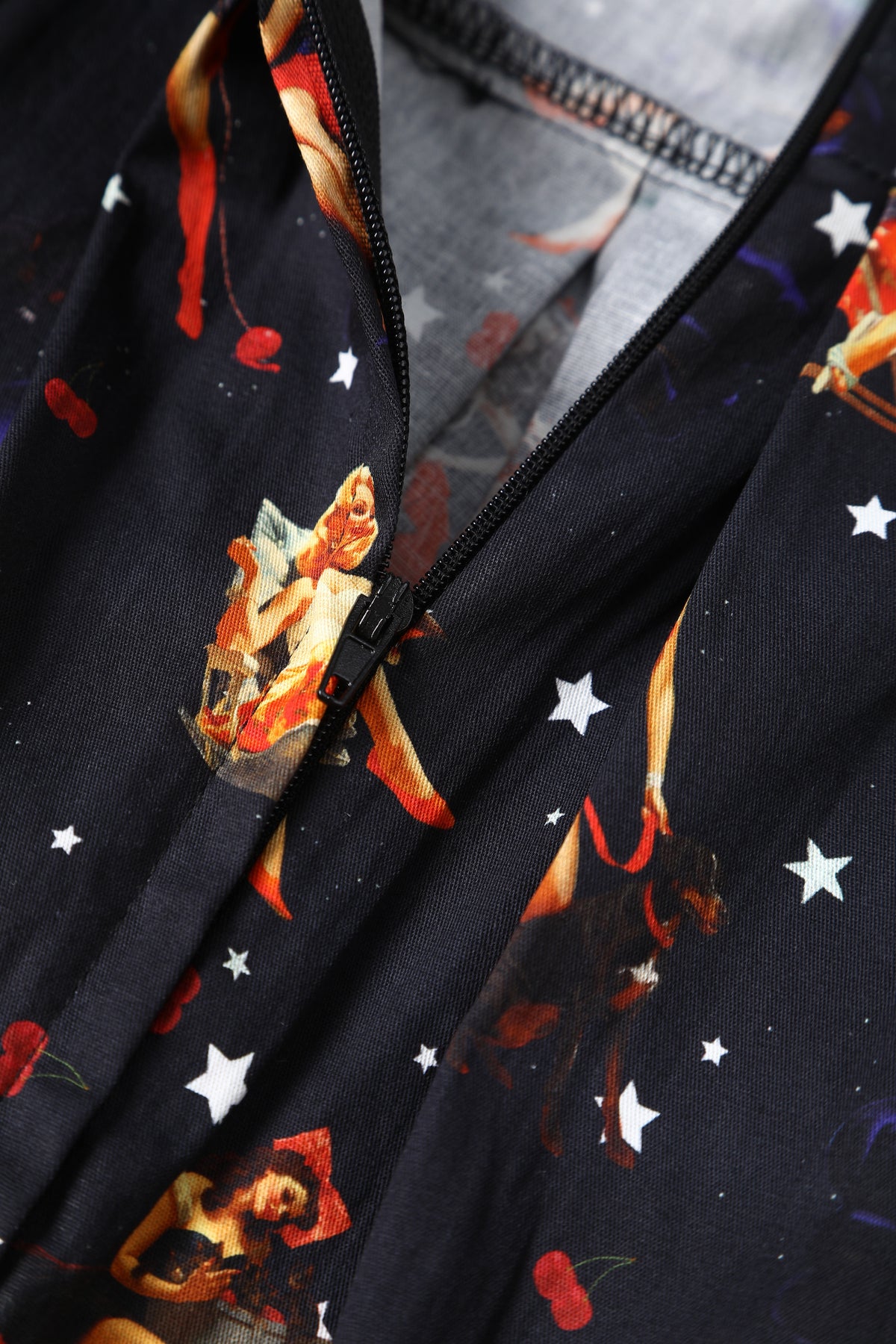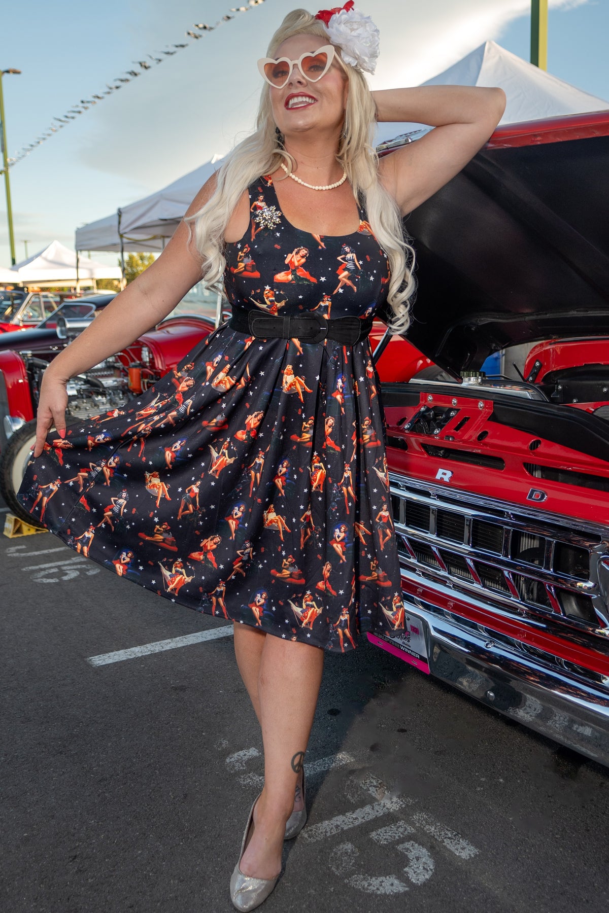 A pinup girl's must have! Designed with a flattering fitted bodice and a simple scoop neckline at the front and back, this retro-style dress is tailored to accentuate your curves in all the right places. The 50s skirt with box pleats adds a touch of vintage charm, while the concealed zip at the back ensures a seamless fit. And guess what? This dress has pockets!