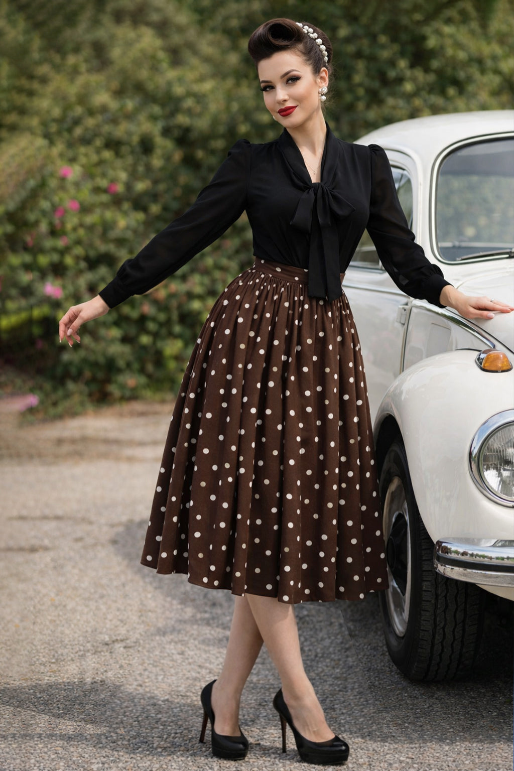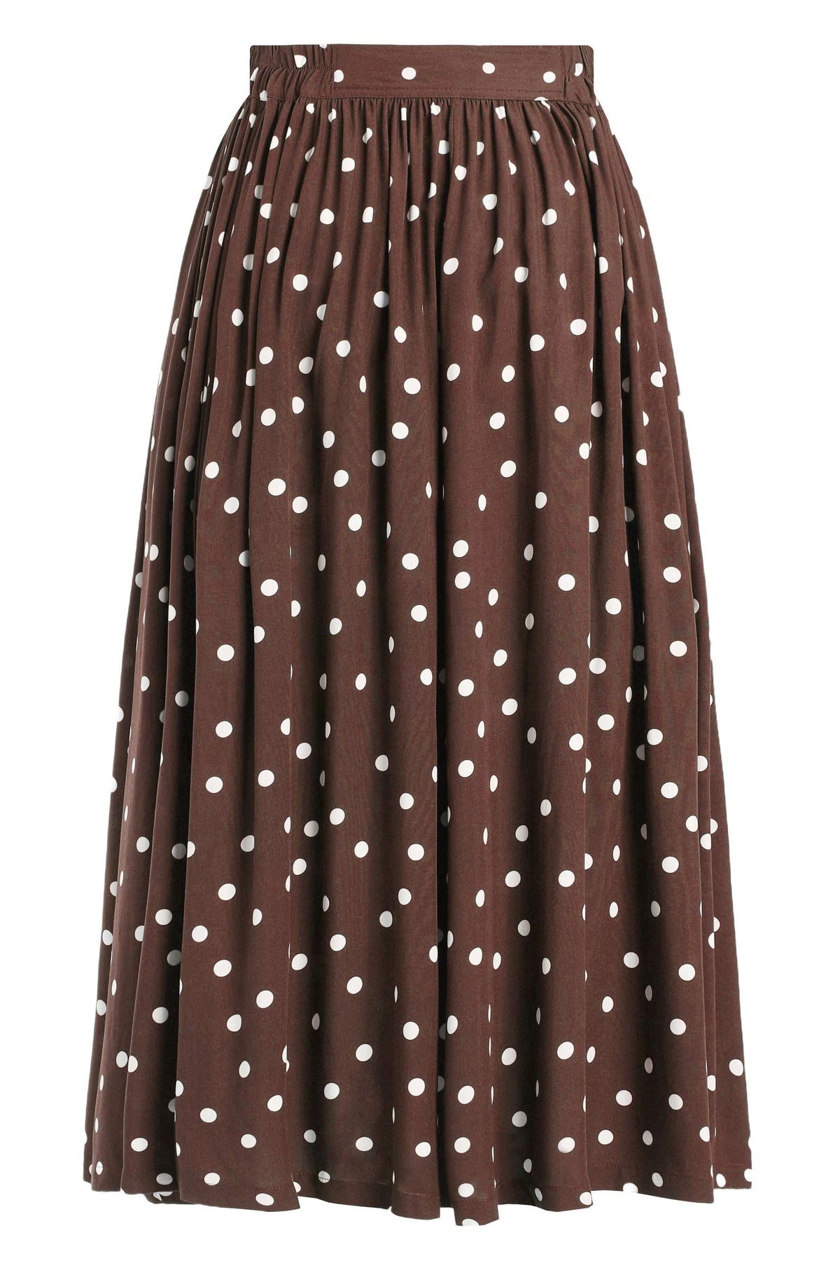 Add a timeless touch to your boutique's collection with our Veronica Vintage Charm Polka Dot Midi Skirt—a perfect blend of retro flair and modern comfort. This elegant A-line skirt features a classic brown base adorned with soft white polka dots, striking the ideal balance between playful and refined.
