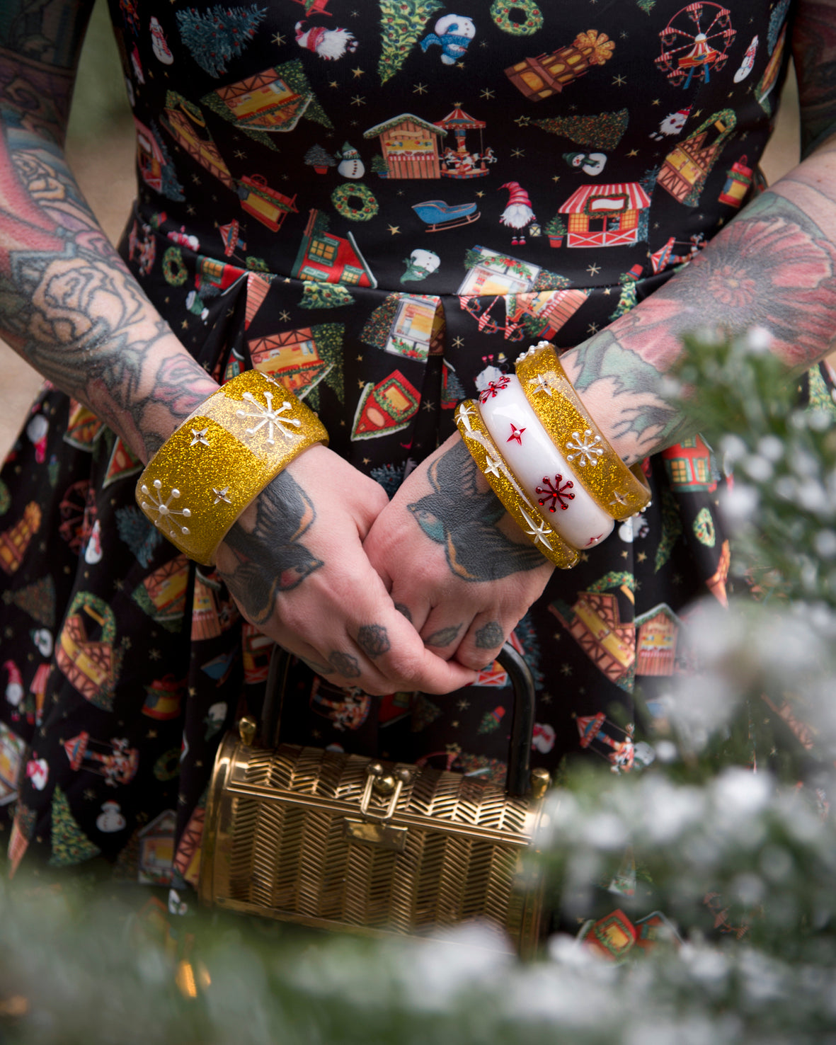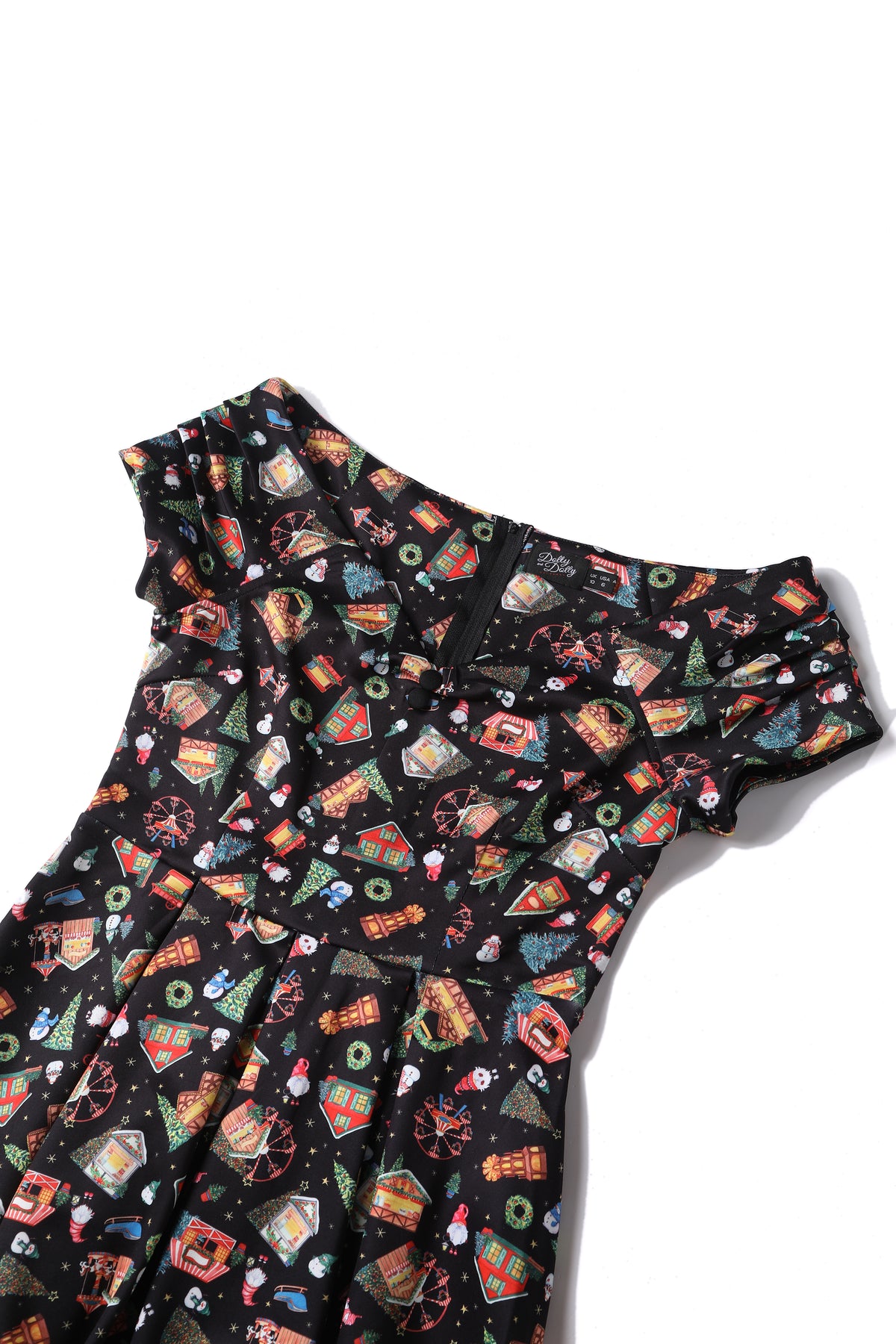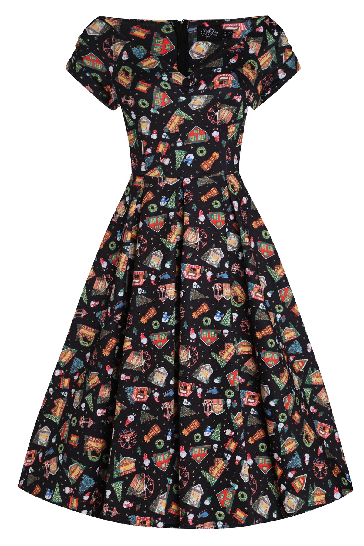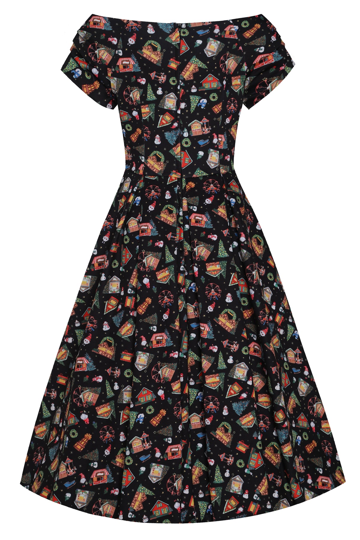 This vintage-style dress is beautifully designed with fabulous 50s-inspired features. The fitted bodice and full circle skirt offer a flattering silhouette and the off-the-shoulder neckline with matching button detail makes it perfect for showing off the collarbone.