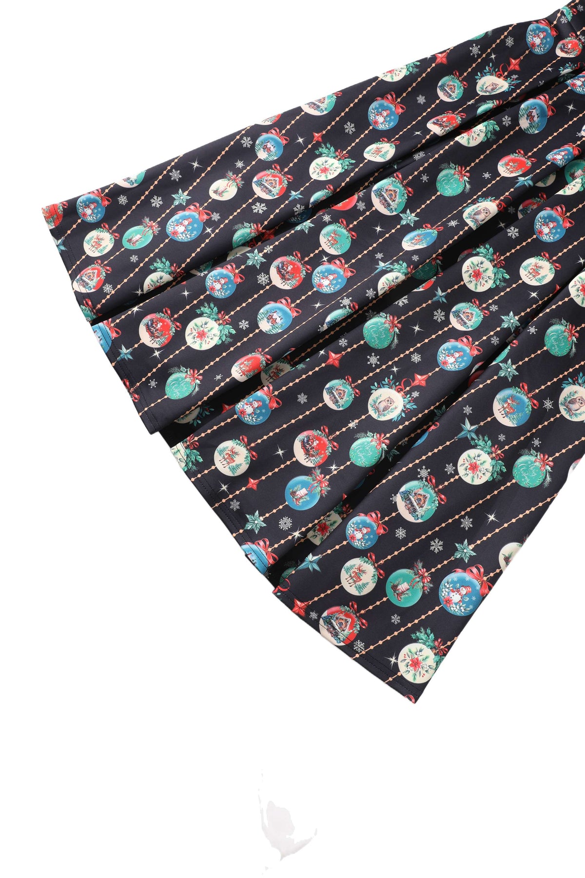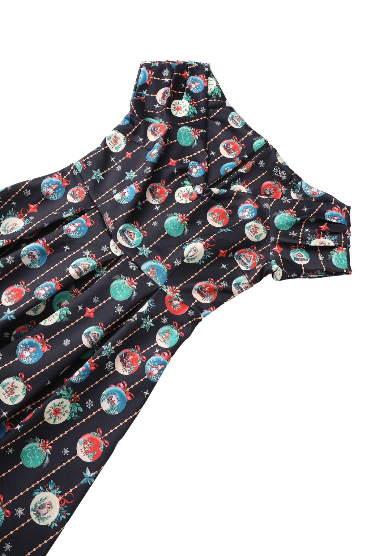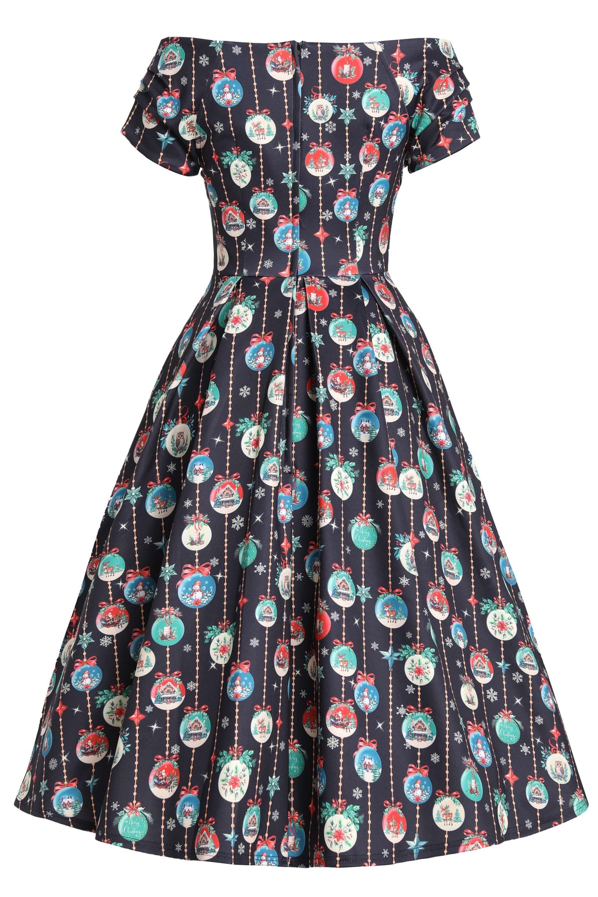 This vintage-inspired off-shoulder dress showcases a matching button detail at the neckline and a fitted bodice with a defined waist. The full circle skirt with box pleats effortlessly creates a graceful silhouette. Side pockets add a practical touch, while the elegant drape and smooth finish make it a standout choice for the festive season.