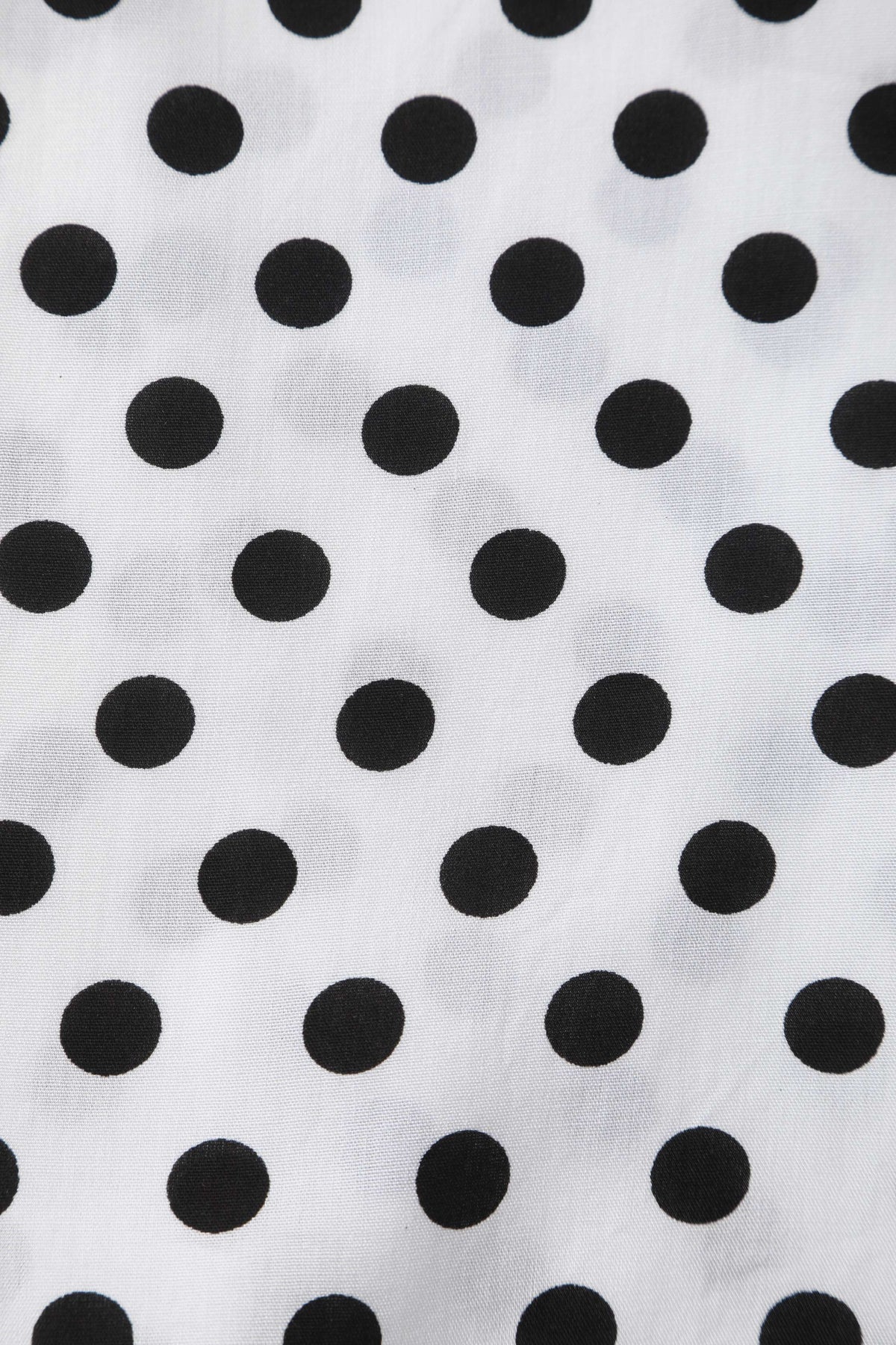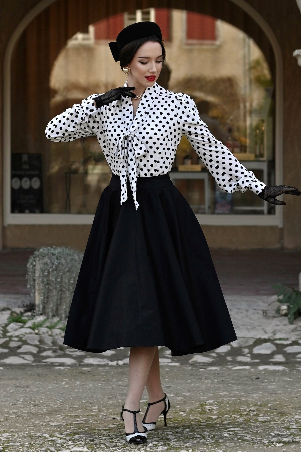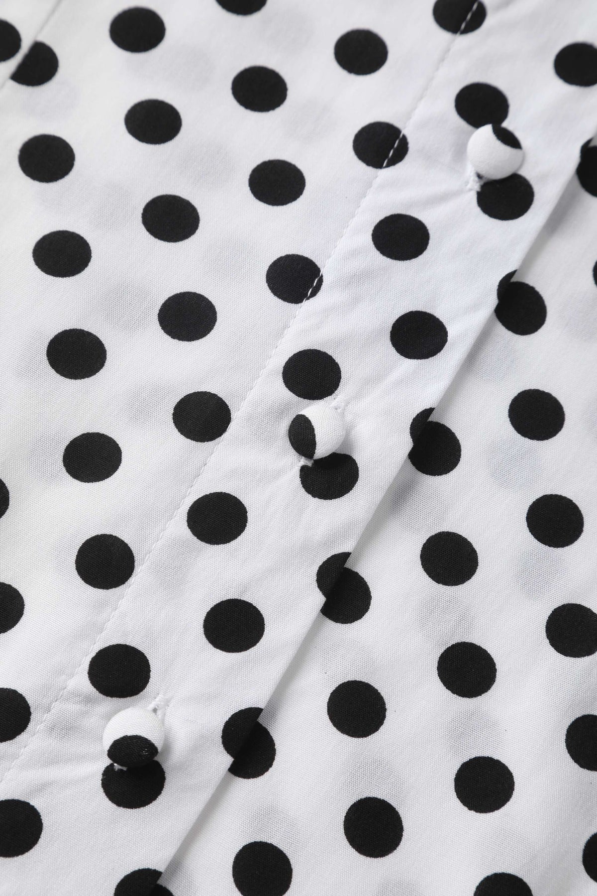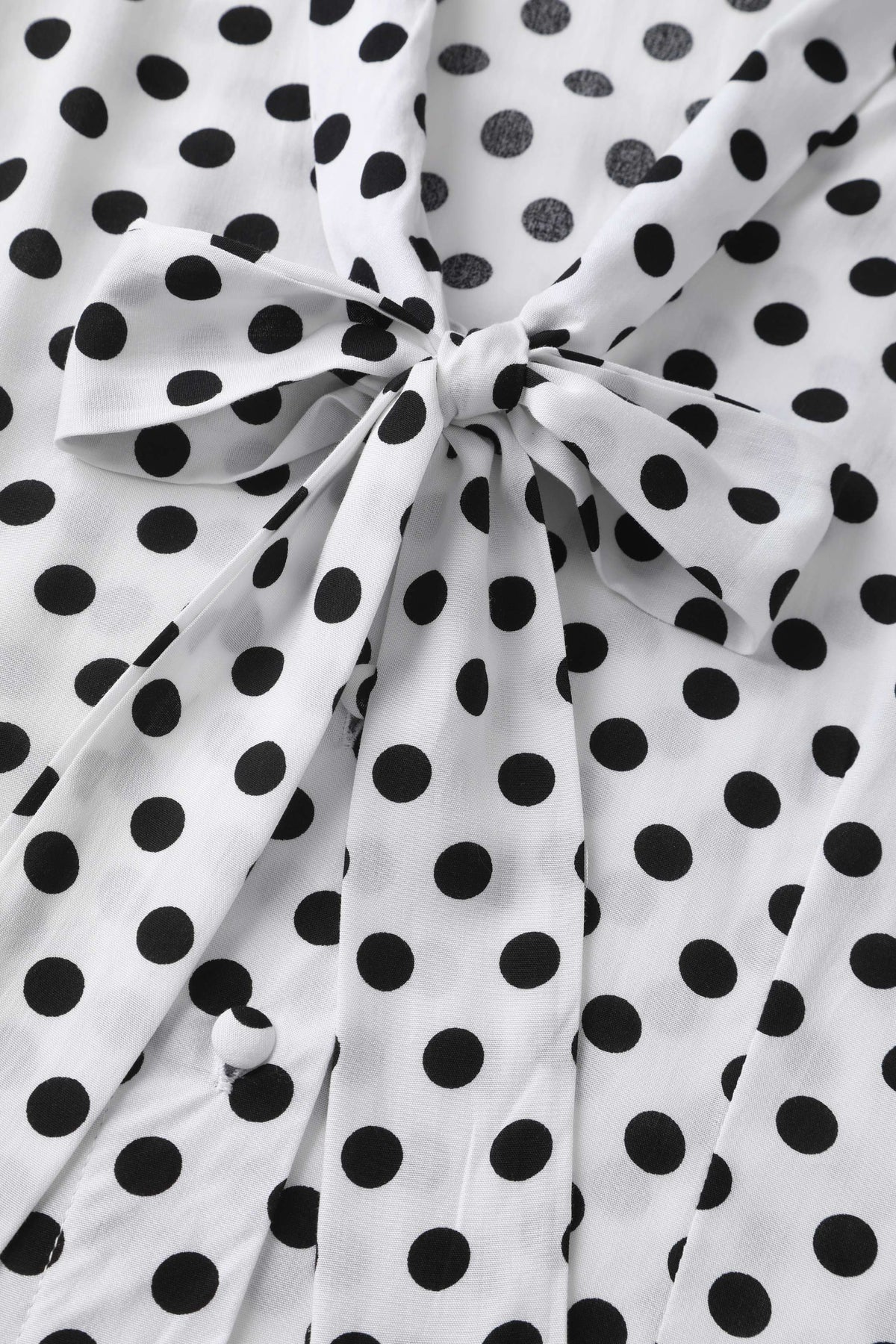 Timeless and effortlessly chic, our Vintage White Polka Dot Blouse is a classic staple every wardrobe needs. Featuring a crisp white base adorned with delicate black polka dots, this blouse channels retro elegance with a modern twist. The charming bow-tie neckline adds a feminine touch, while the tailored fit flatters beautifully for both casual and dressy occasions.