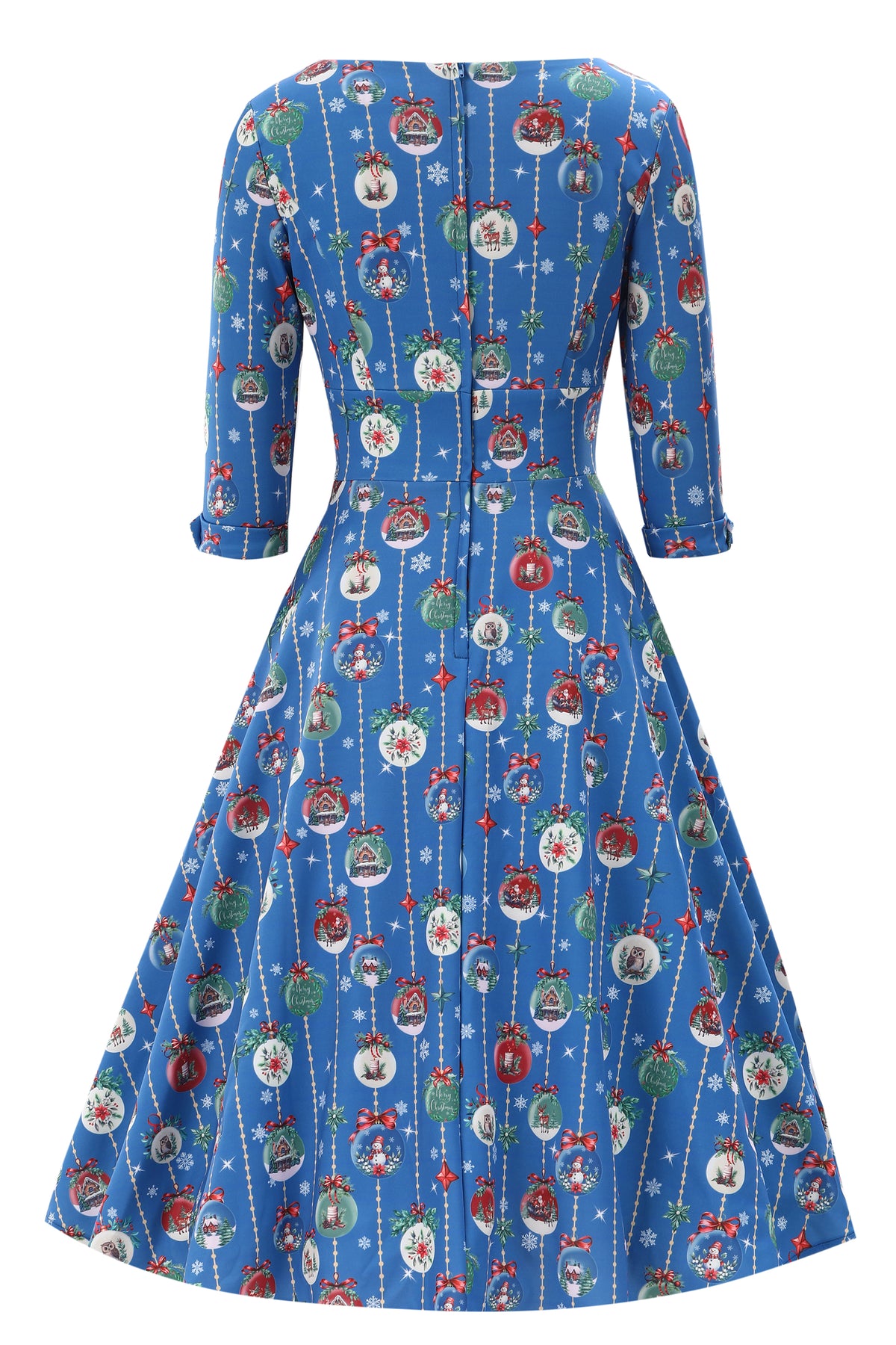 Bring holiday cheer to your boutique with this charming Blue Bauble Christmas Swing Dress. Designed with a flattering fit-and-flare silhouette, this dress features playful prints of festive ornaments, snowflakes, and stars on a cheerful royal blue background. The three-quarter sleeves with a subtle cuff detail make it perfect for cooler days, while the classic vintage-inspired cut offers a timeless look your customers will love.