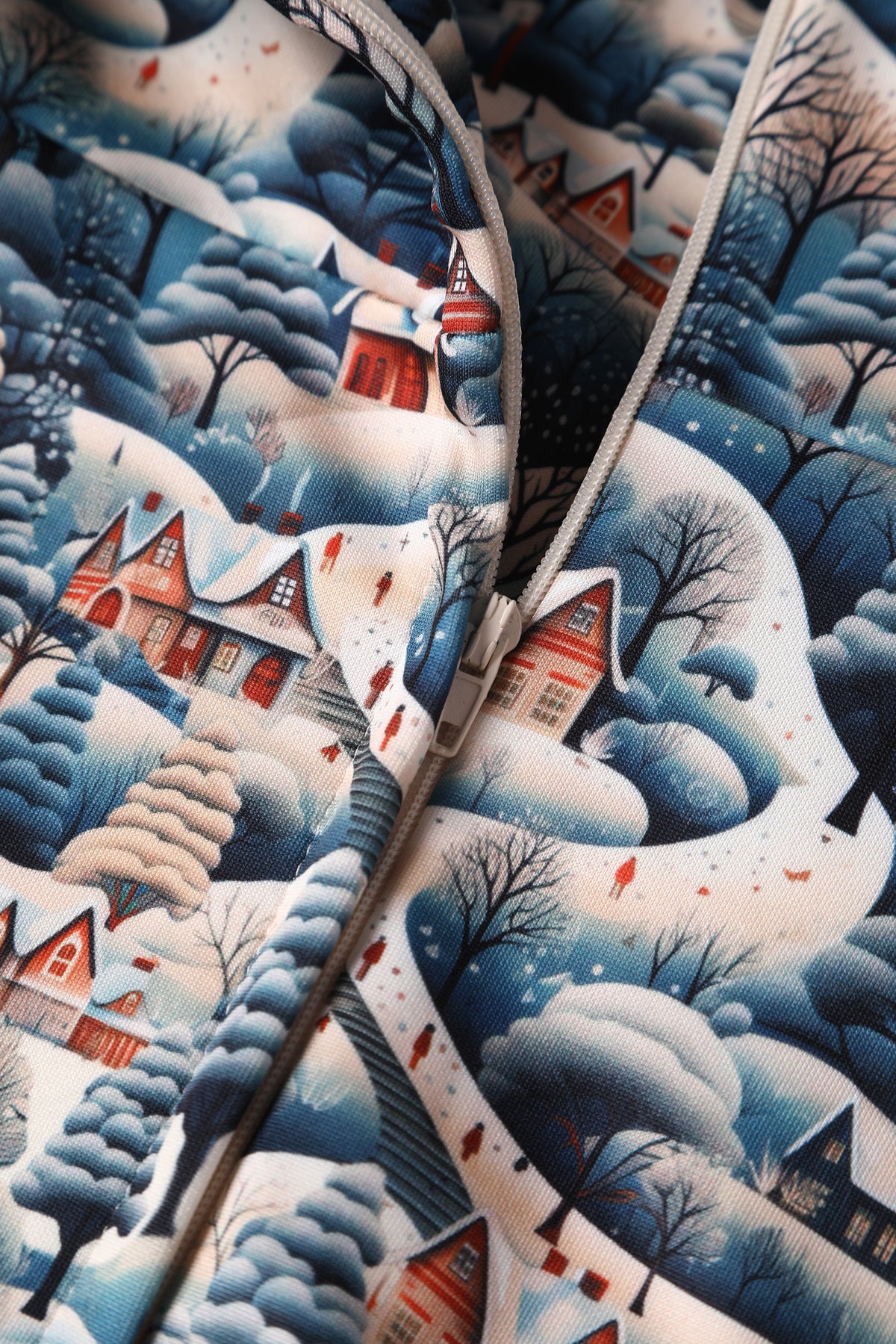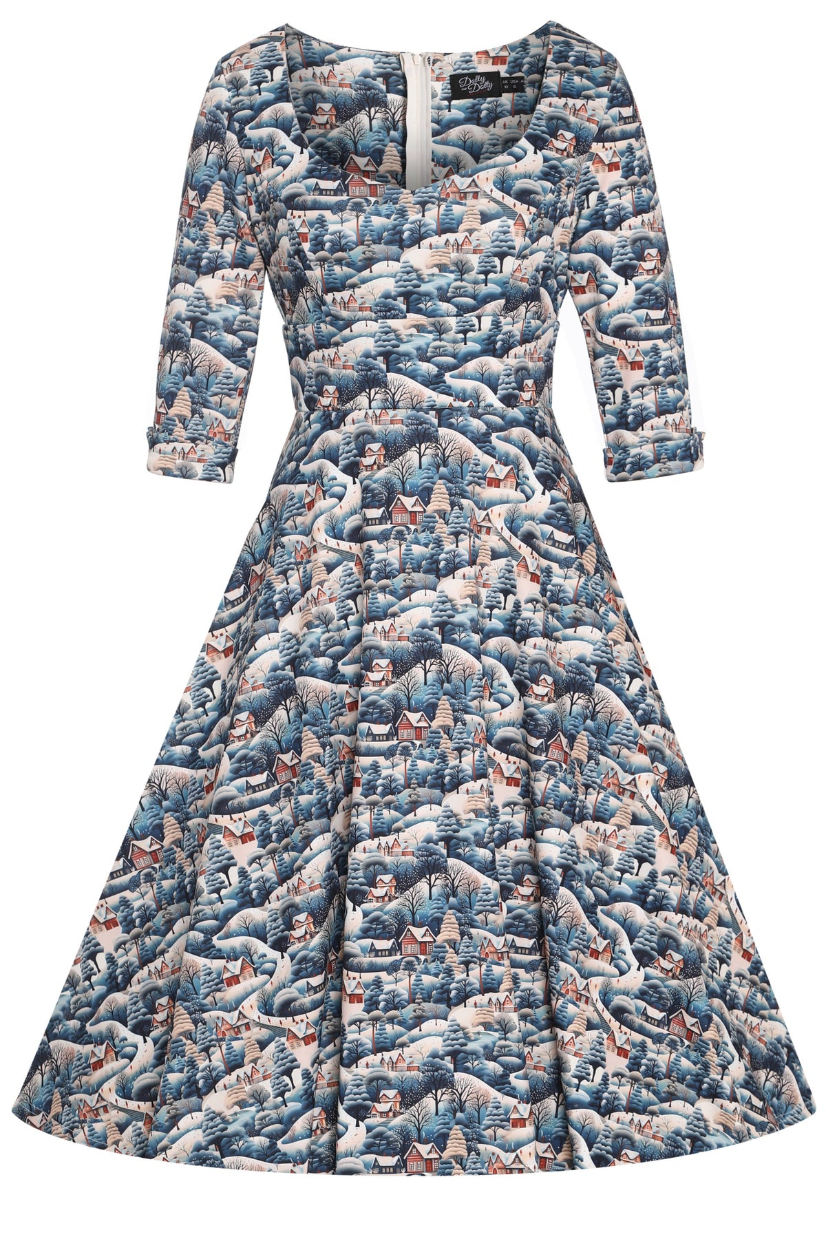 This charming dress features a serene winter landscape print, showcasing cozy cottages nestled among snowy hills and frosty trees. The intricate design, in shades of blue and white with pops of red, captures the peaceful essence of a winter village. With three-quarter sleeves and a modest scoop neckline, it combines both warmth and style, perfect for seasonal gatherings or casual outings during colder months. It has hidden side pockets on both sides—ideal for keeping small essentials close without disrupting the dress's smooth silhouette. The dress also offers a comfortable fit with a hidden zipper at the back, completing its enchanting design.
