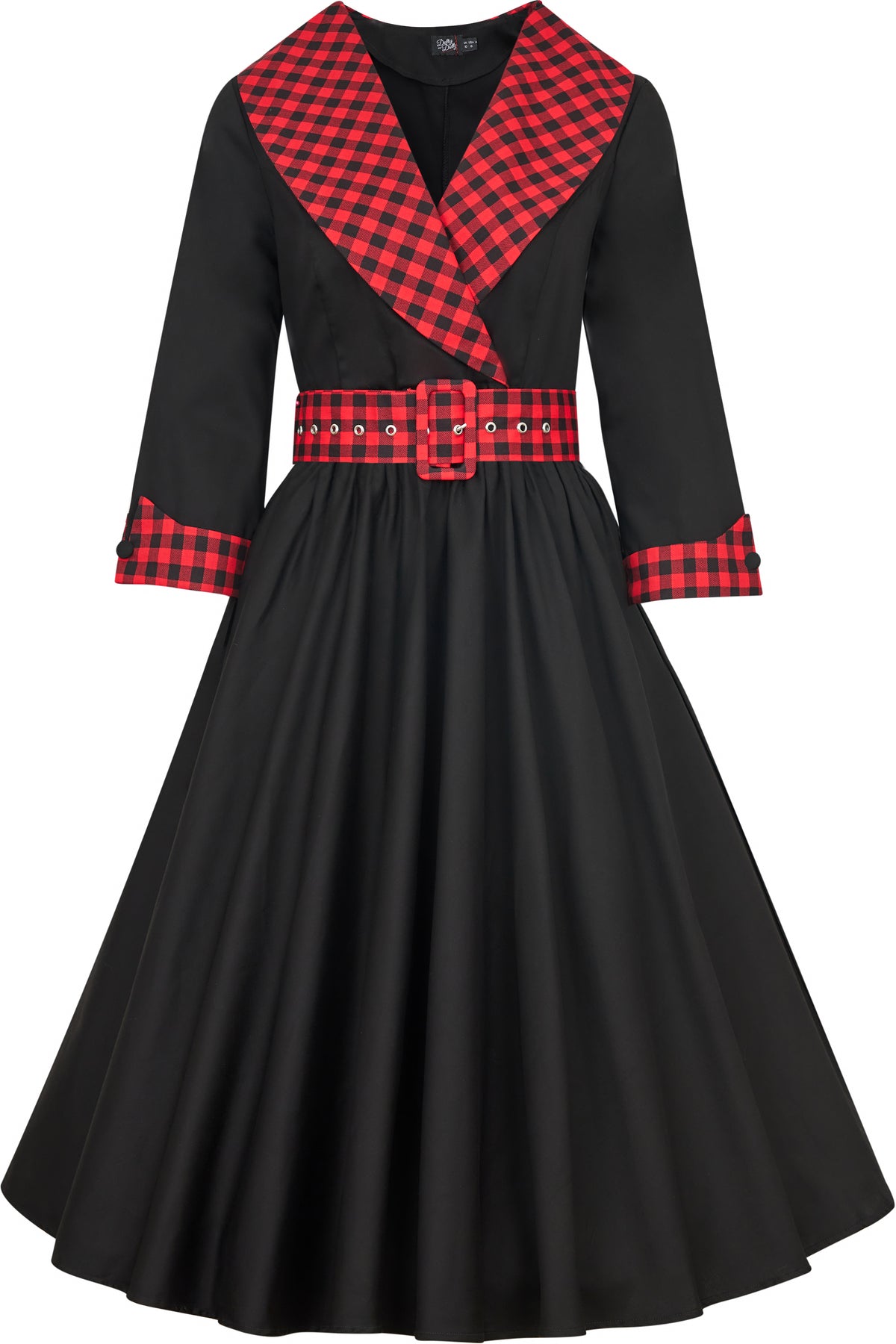 Our Tiffany 50s style swing dress features flattering three-quarter length sleeves, a wrap-over style bust, a low v-neckline, a retro style collar, a fitted waistband, and a gorgeous full skirt. This flirty vintage dress is made from lovely soft cotton with stretch and fastens with a concealed zip. Belt included.