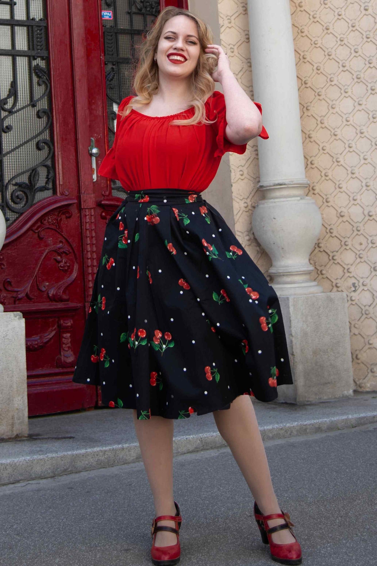Our Carolyn skirt is adorned with cute box pleats and a super rockabilly print. The stretchy knit fabric makes this skirt very comfortable to wear despite having a fitted waist. Wear it with a petticoat to give Carolyn a special occasion look or wear it on its own to create a casual day wear look. And it has pockets!