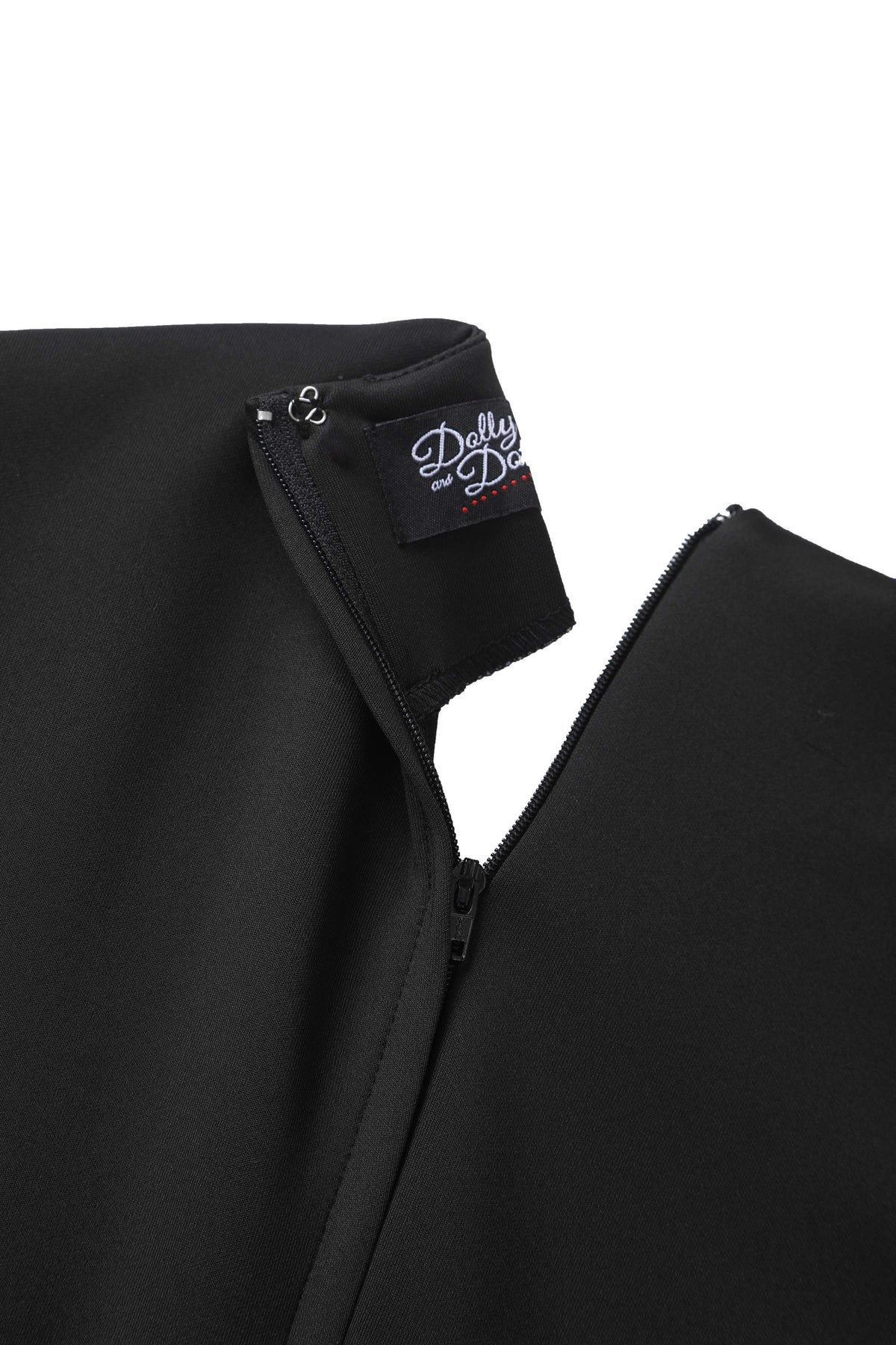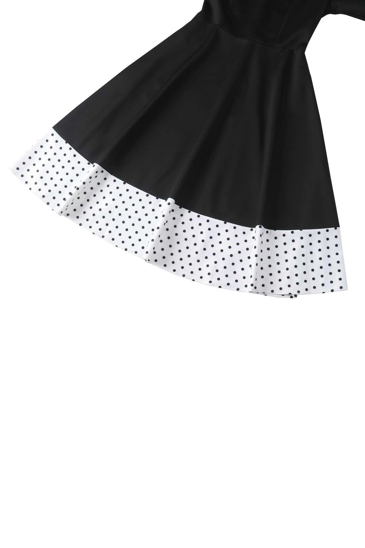 Step into timeless sophistication with this classic black A-line dress, featuring a flattering V-neckline and three-quarter sleeves. The crisp white cuffs and hemline are adorned with delicately scattered, small black polka dots—adding a playful yet refined contrast. Perfect for both daytime events and evening occasions, this dress combines vintage charm with modern elegance. Thoughtfully designed with hidden pockets, it offers both practicality and polish—a versatile and classy option your customers will reach for again and again.