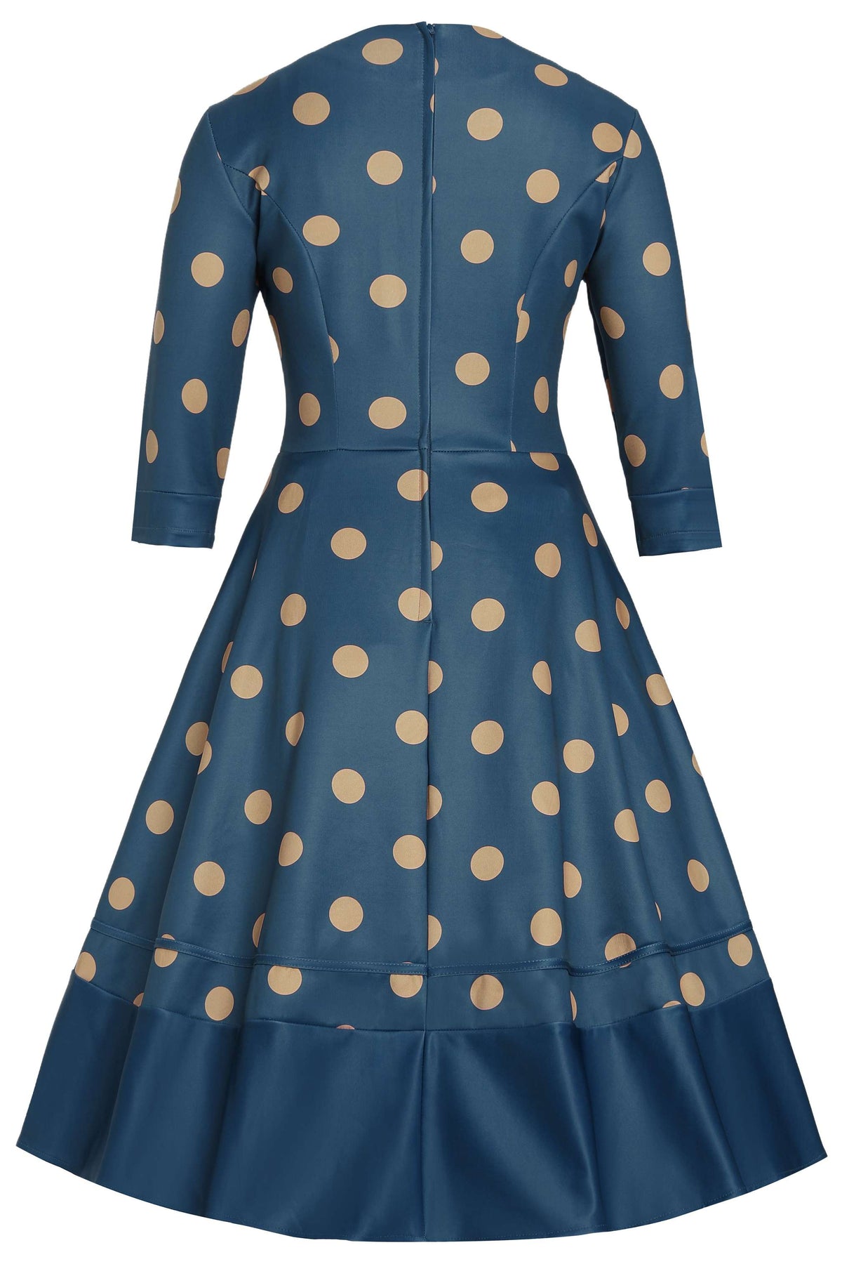Step into timeless sophistication with this classic blue A-line dress, featuring a flattering V-neckline and three-quarter sleeves. The crisp white cuffs and hemline are adorned with delicately scattered, small blue polka dots—adding a playful yet refined contrast. Perfect for both daytime events and evening occasions, this dress combines vintage charm with modern elegance. Thoughtfully designed with hidden pockets, it offers both practicality and polish—a versatile and classy option your customers will reach for again and again.